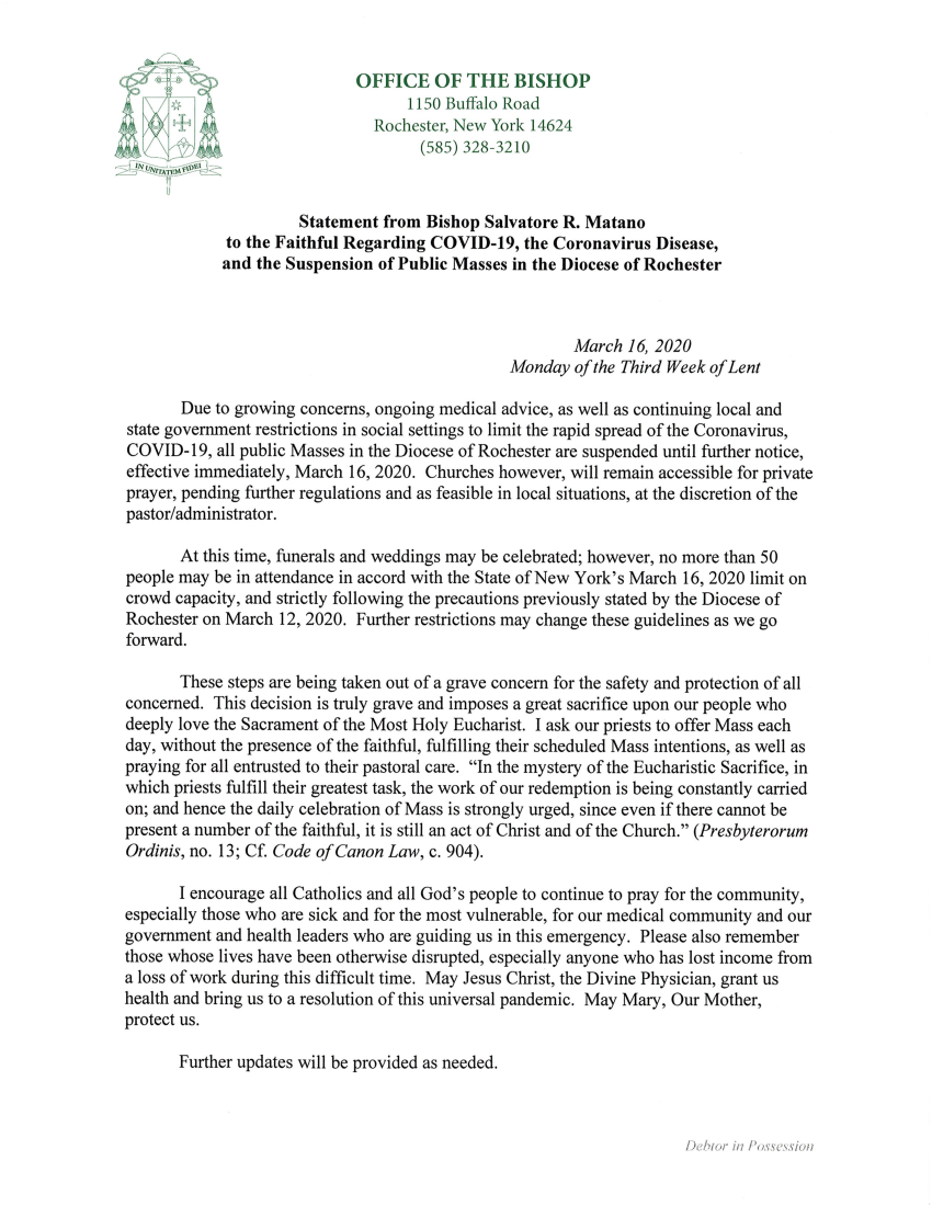 Effective immediately, the Diocese of Rochester has suspended all public masses. For details, please see the statement to the faithful from Bishop Salvatore Matano below or by clicking here.